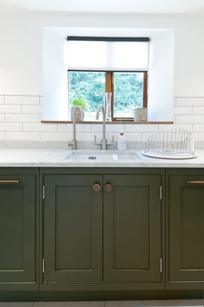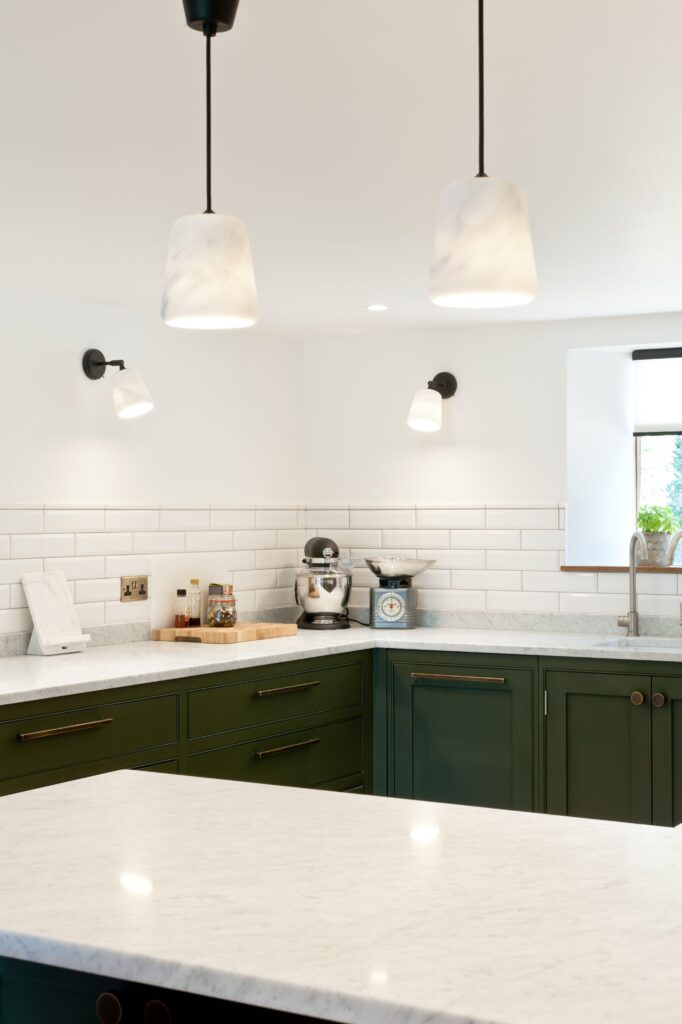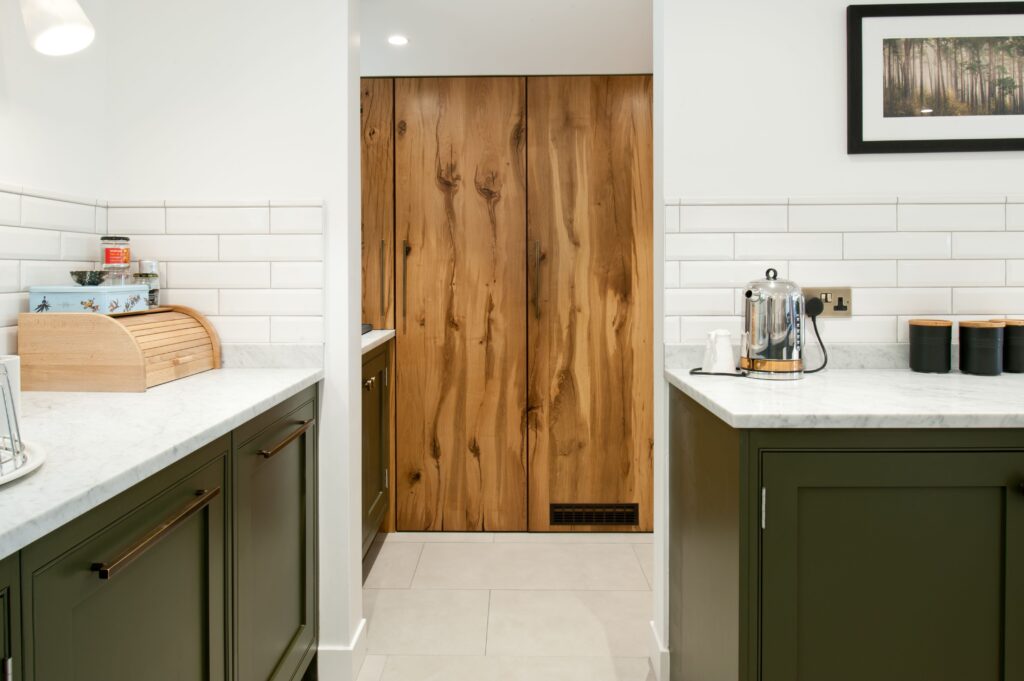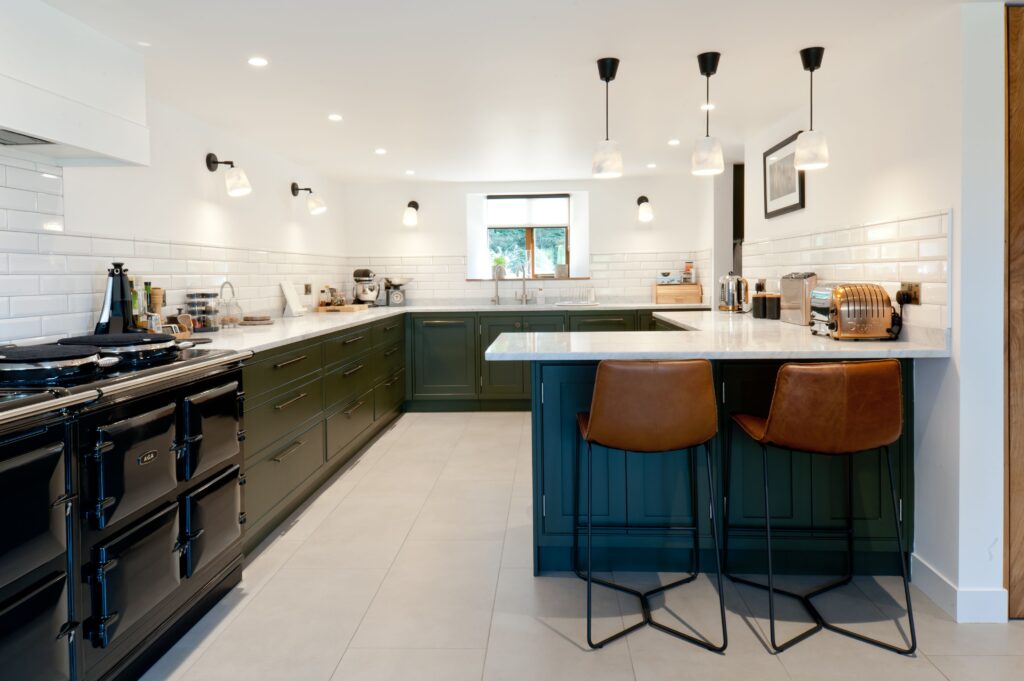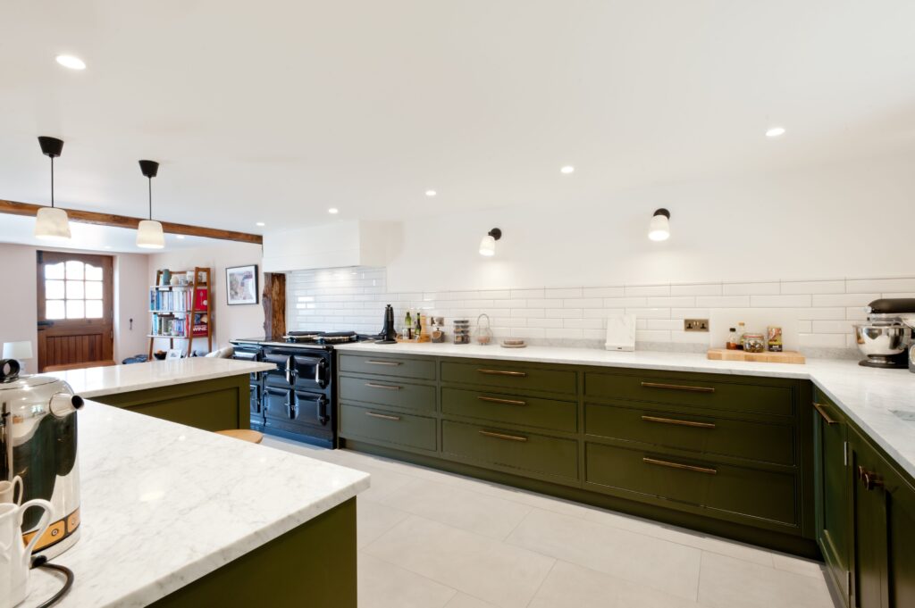 Mylands of London dark green “Messel” painted units are offset beautifully with solid oak reclaimed boards by Admonter. Worktops are Carrera Marble with an iconic AGA. Bespoke handles by Ged Kennett