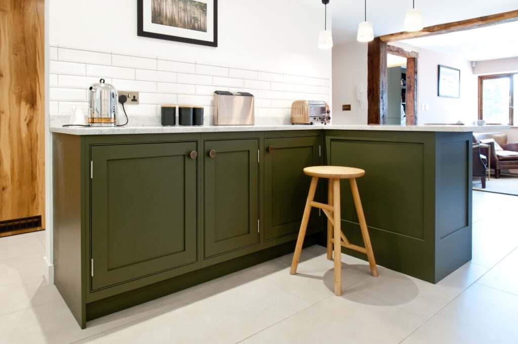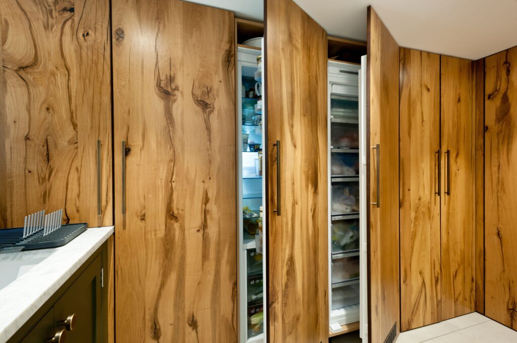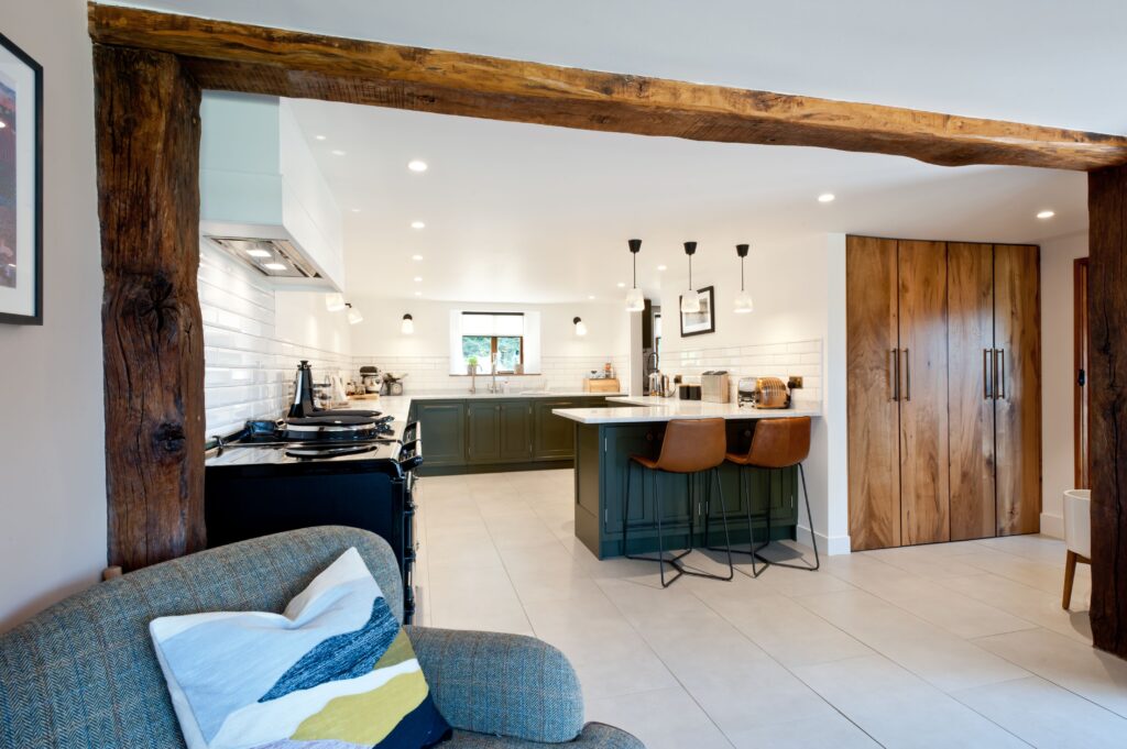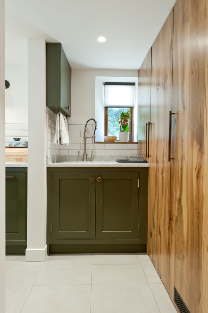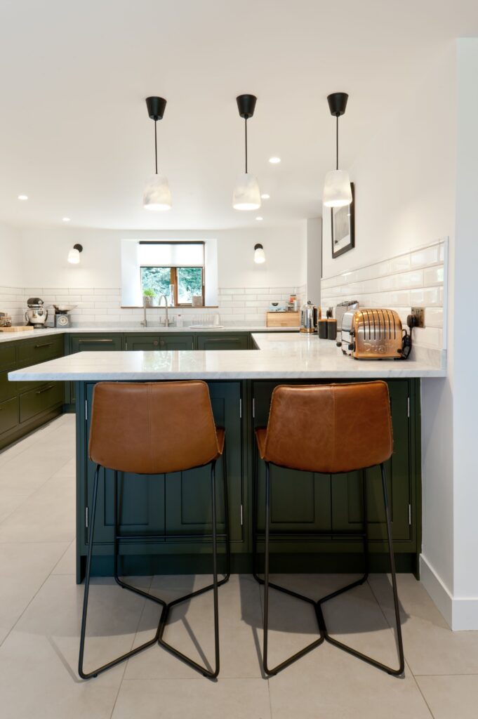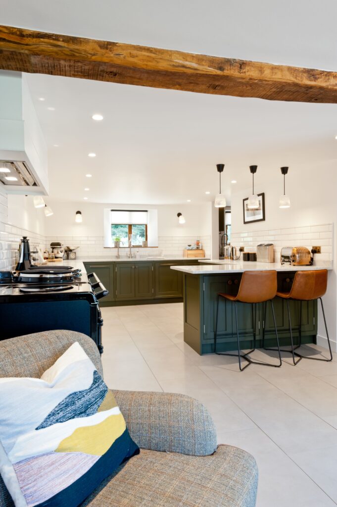 Mylands of London dark green “Messel” painted units are offset beautifully with solid oak reclaimed boards by Admonter. Worktops are Carrera Marble with an iconic AGA. Bespoke handles by Ged Kennett