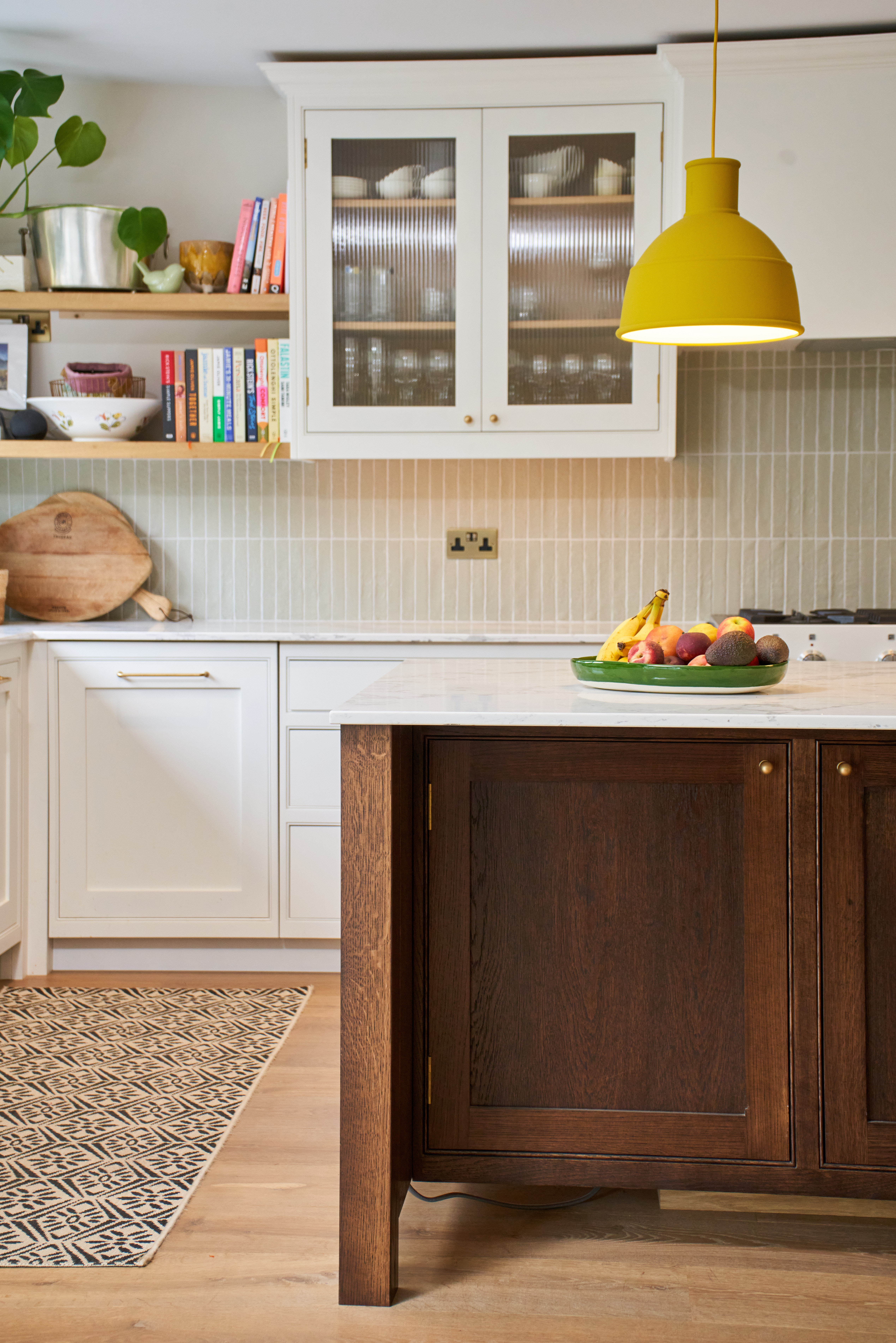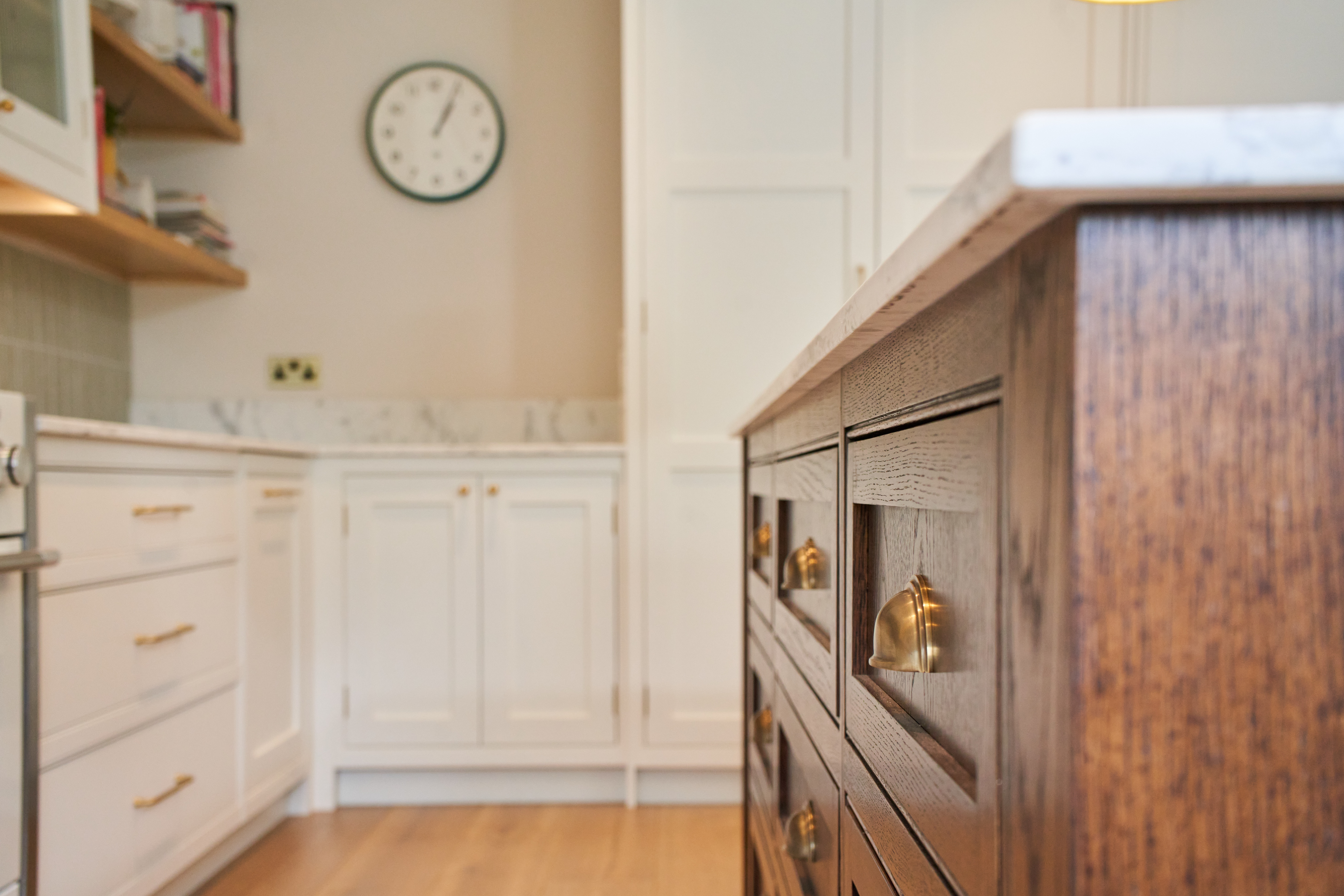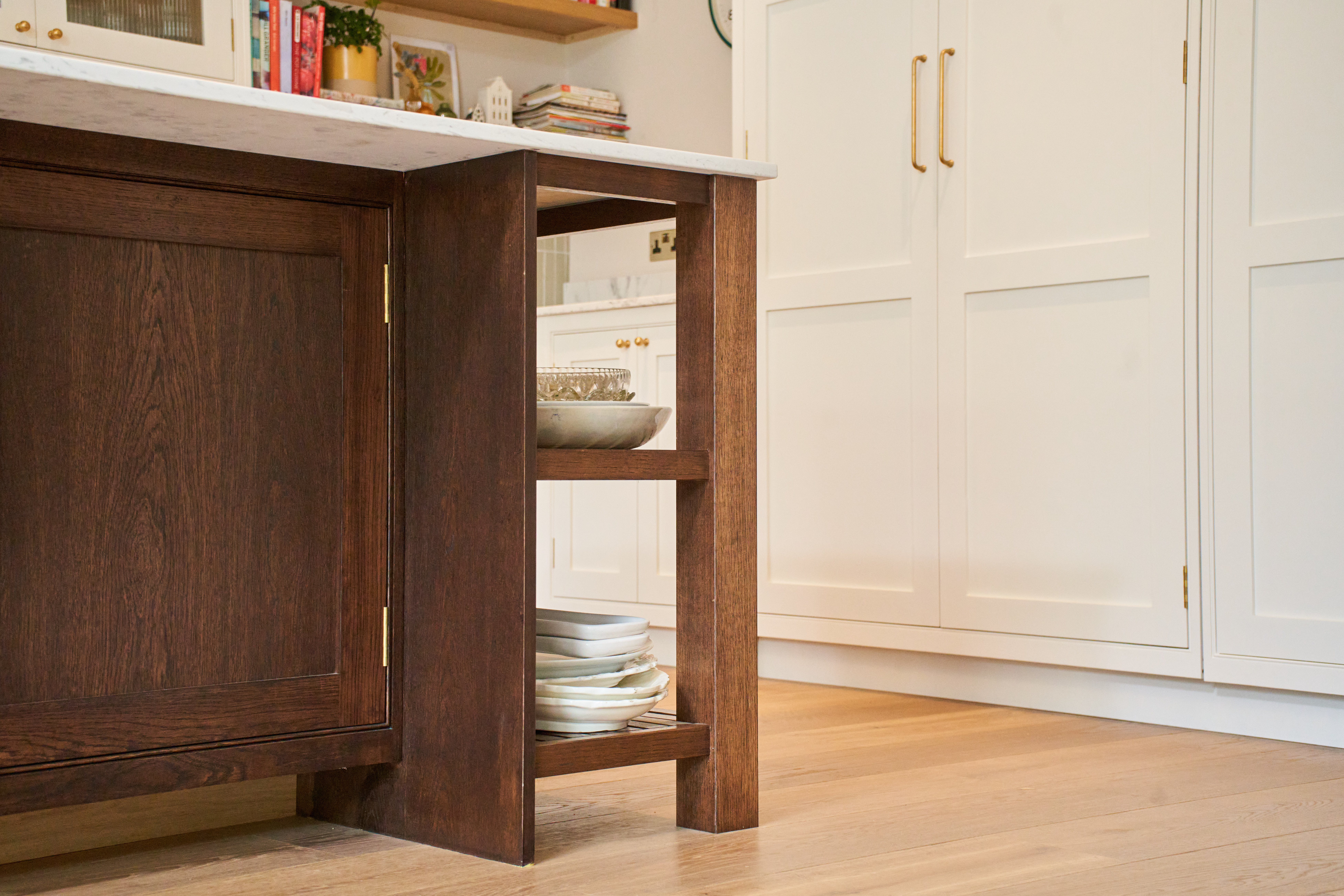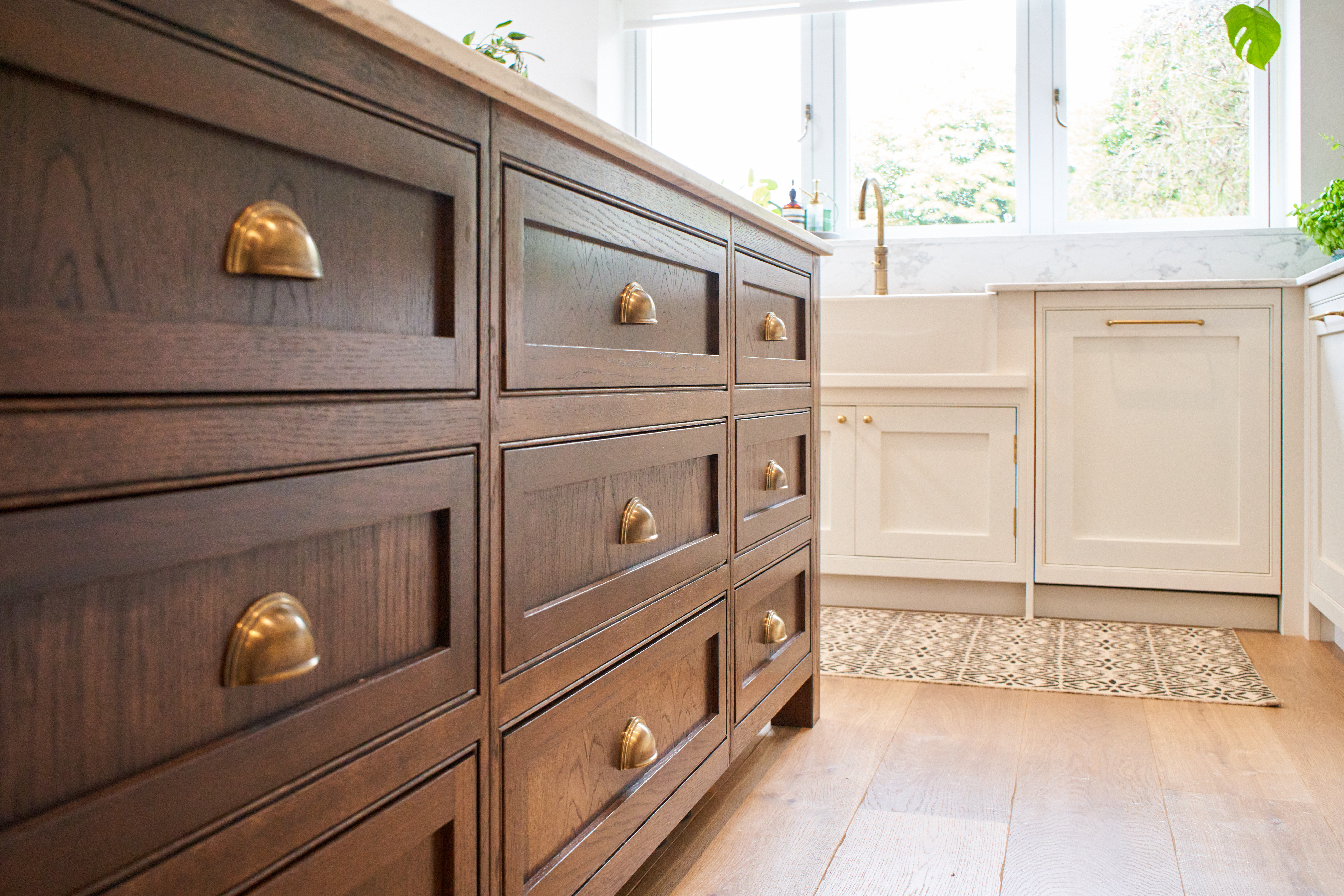 The stained oak island is the focal point of this space. Wanting to create a freestanding feel to this island we have pushed the plinth line back and matched it to the floor making it less visible, creating a piece of furniture with a grander presence. With open shelving on one end and our classic 9 drawer set up on the other side this island boasts storage and style and has space for 4 stools making it sociable too.