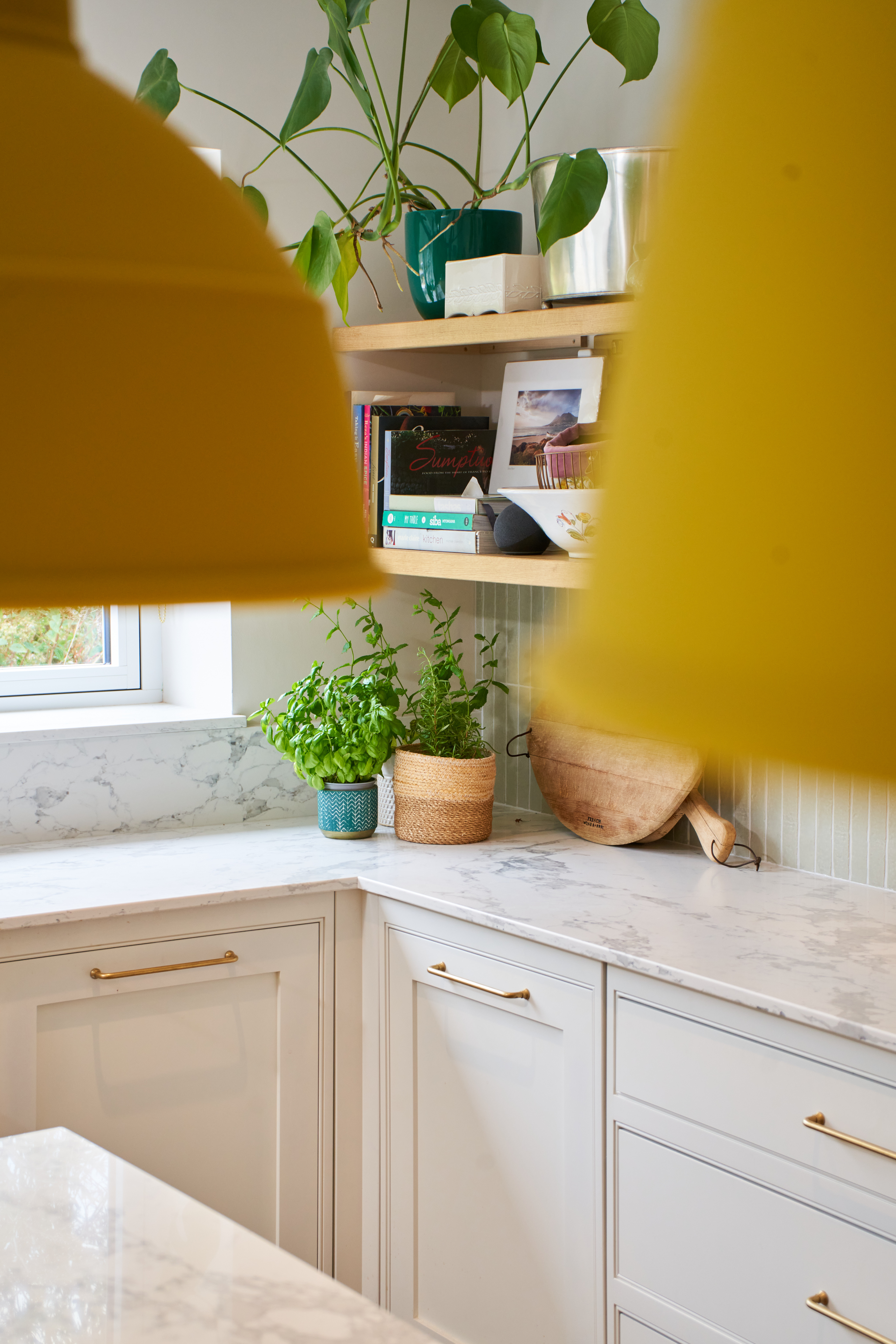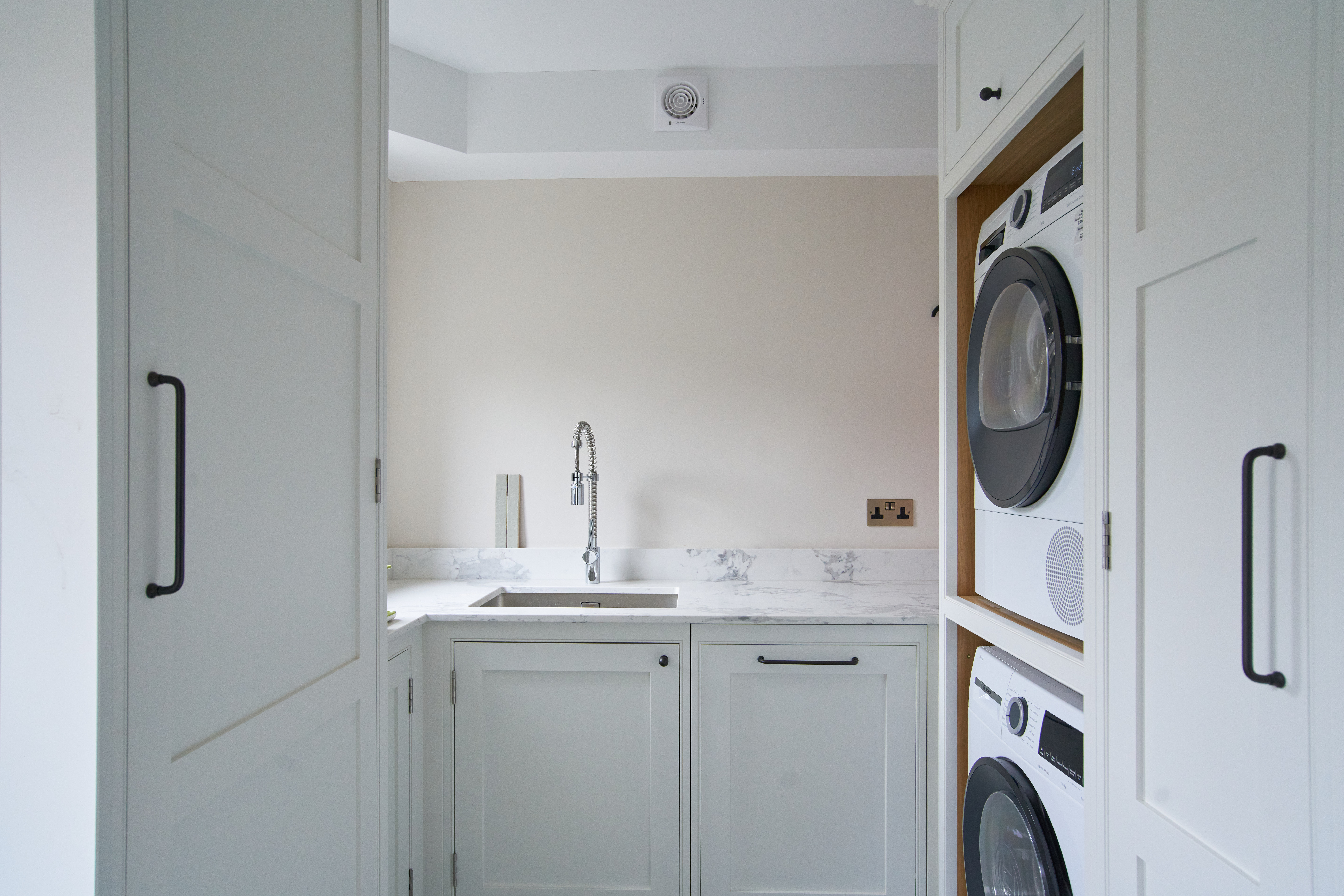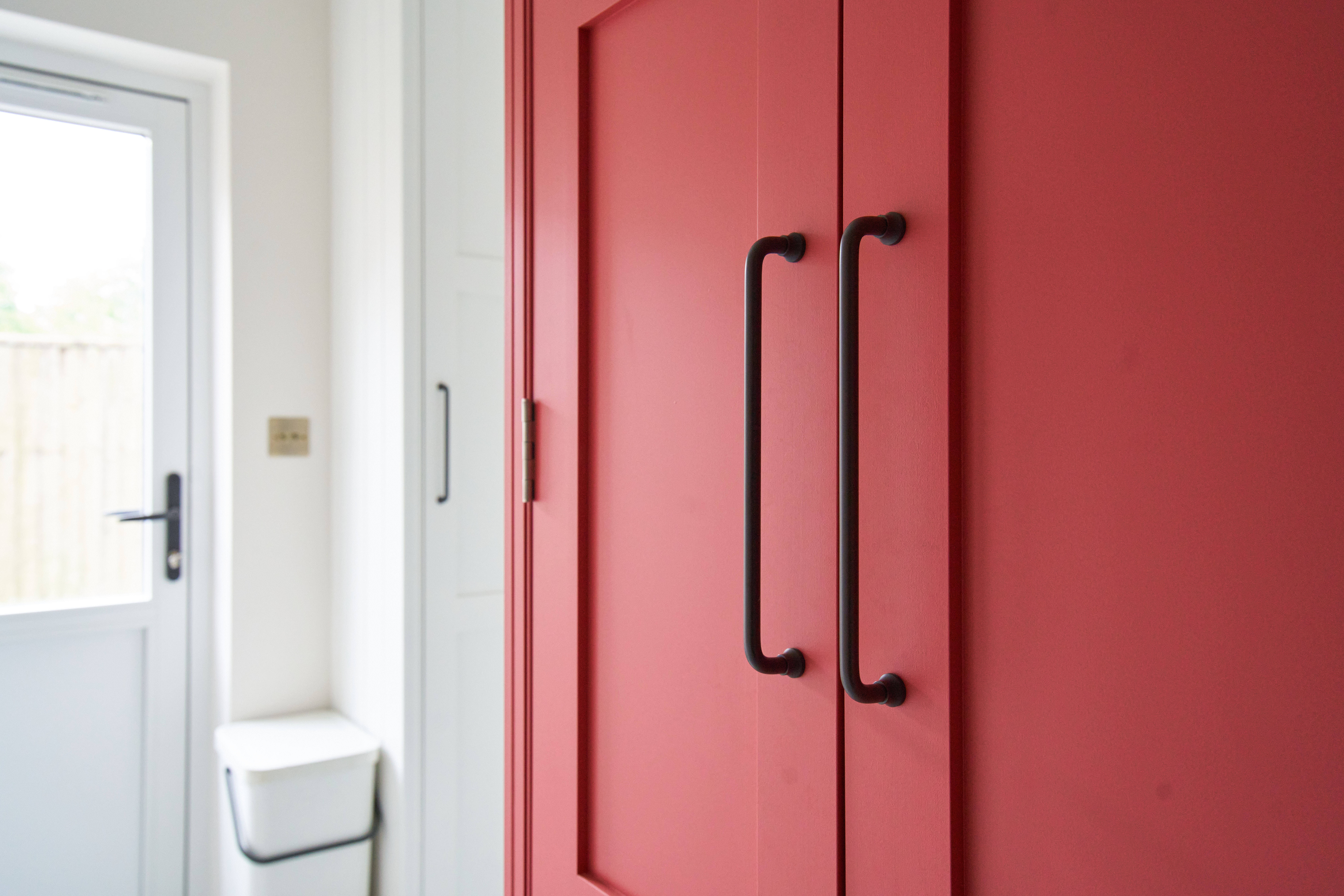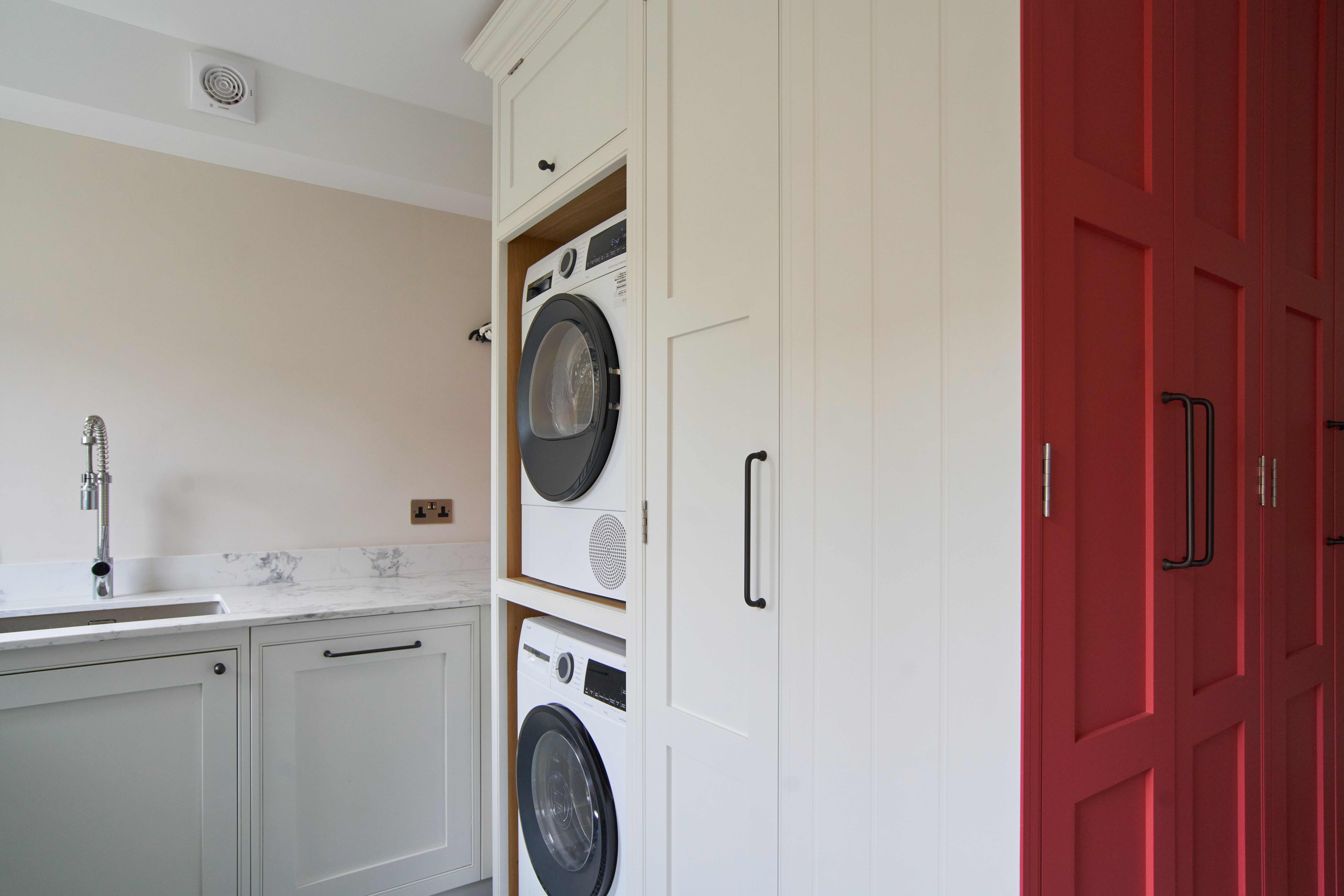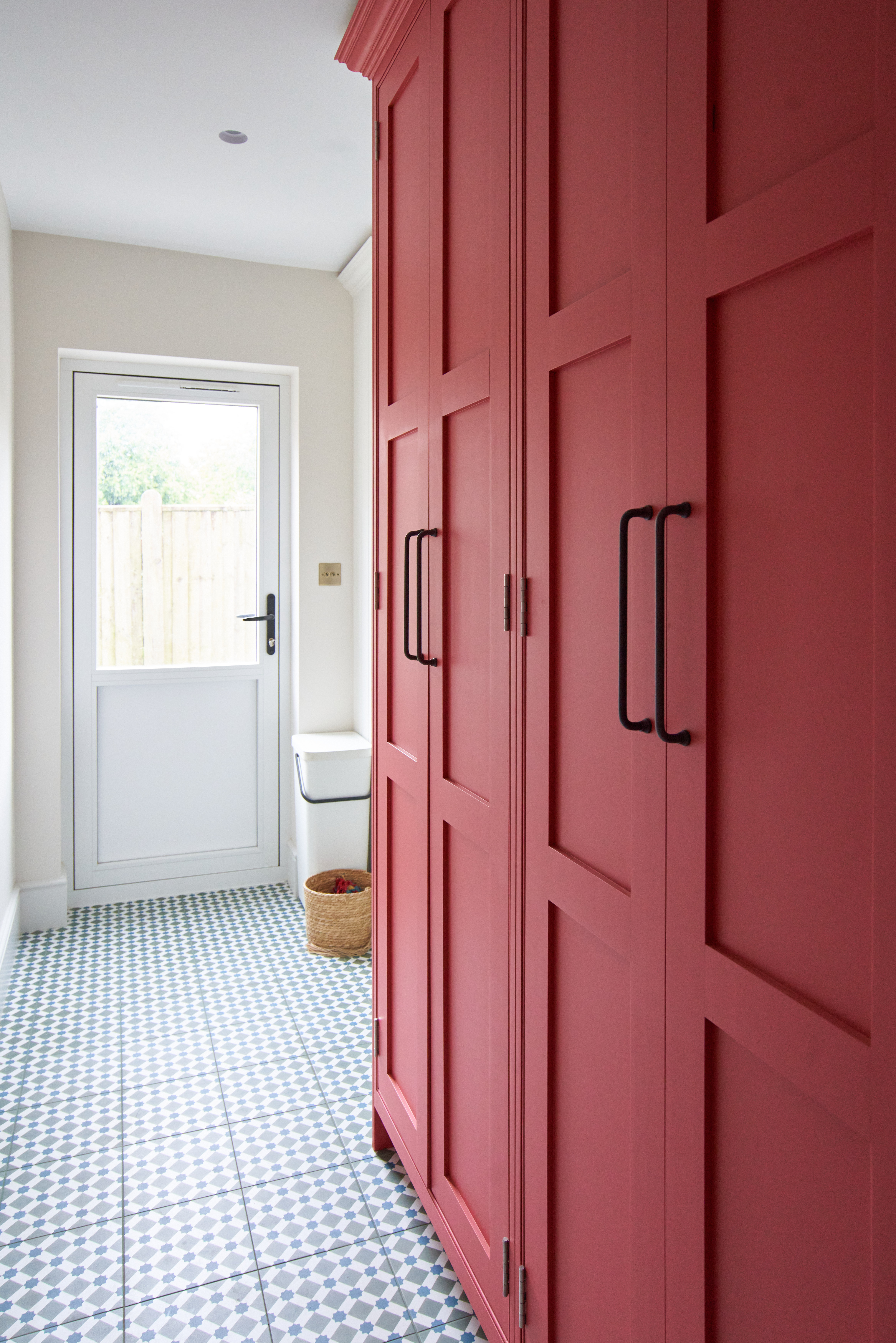 The fun pop of colour in the utility room livens up the small space. This room maximises storage and is completely functional and practical for this busy family home.