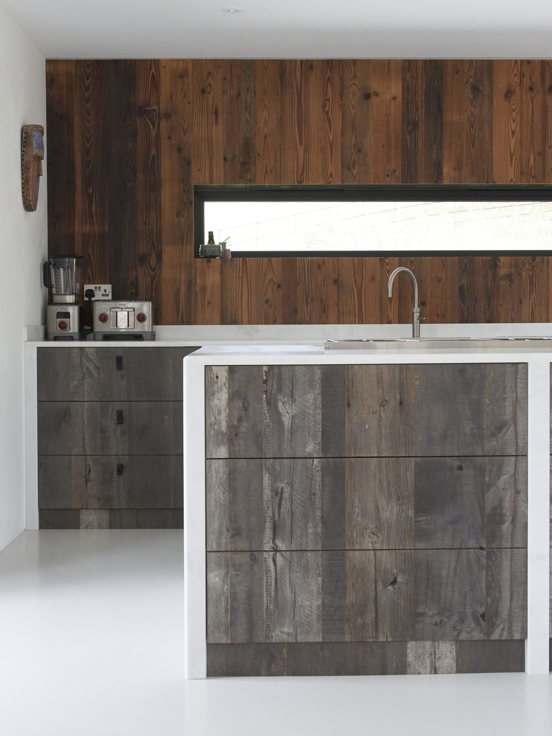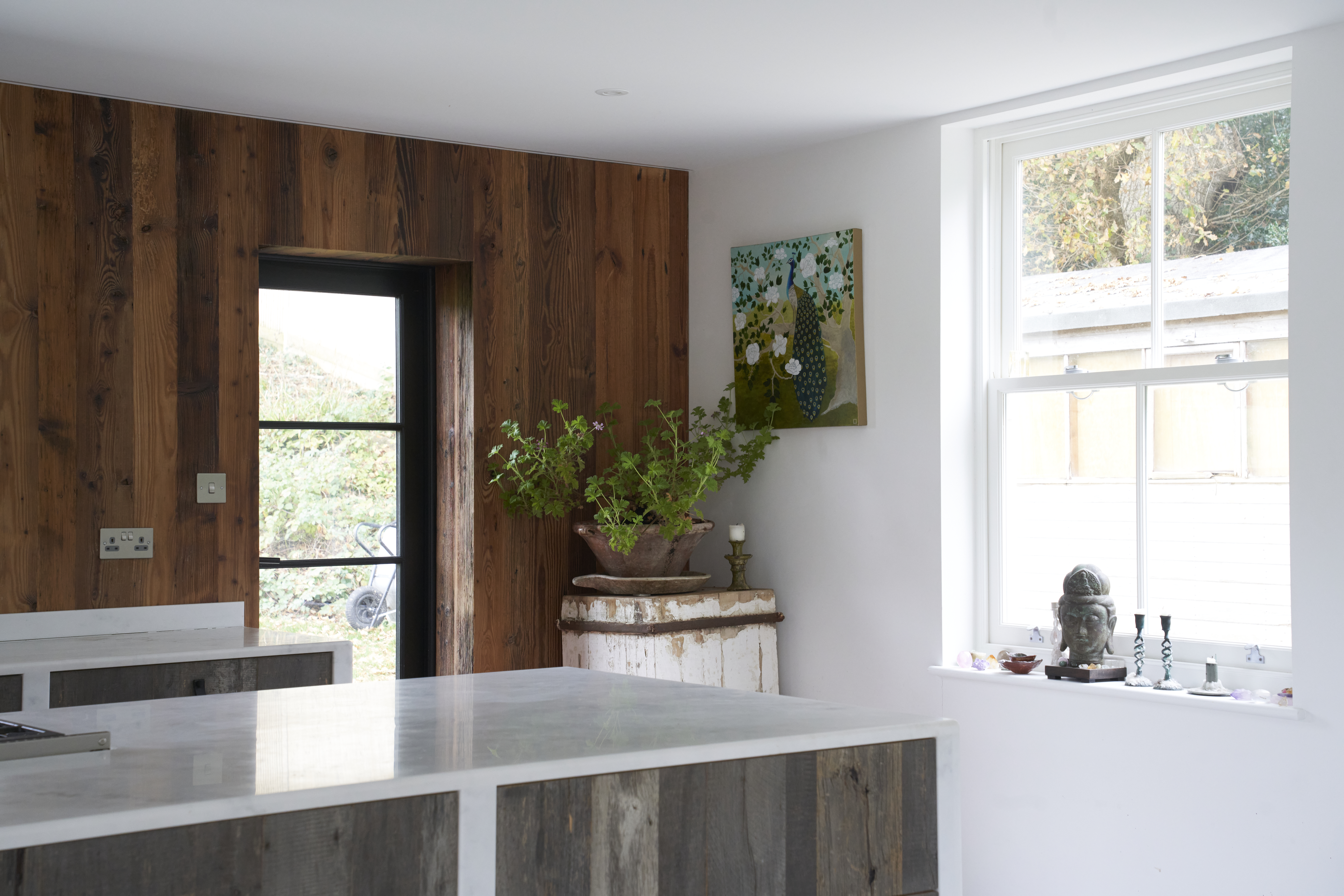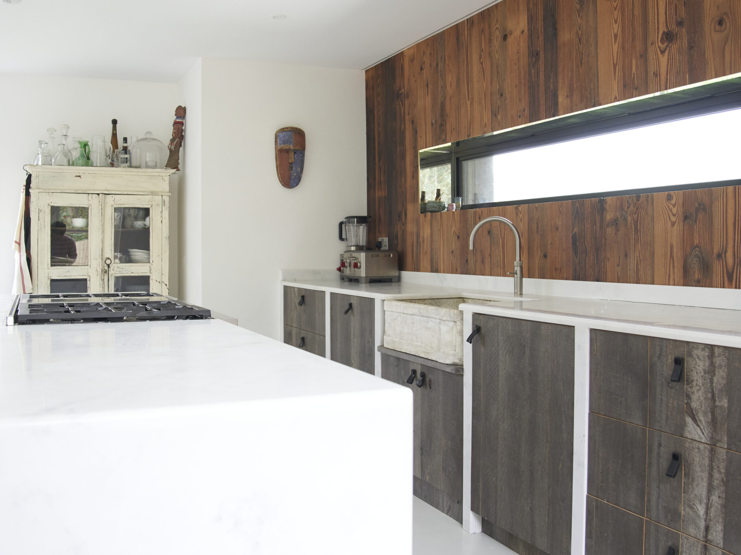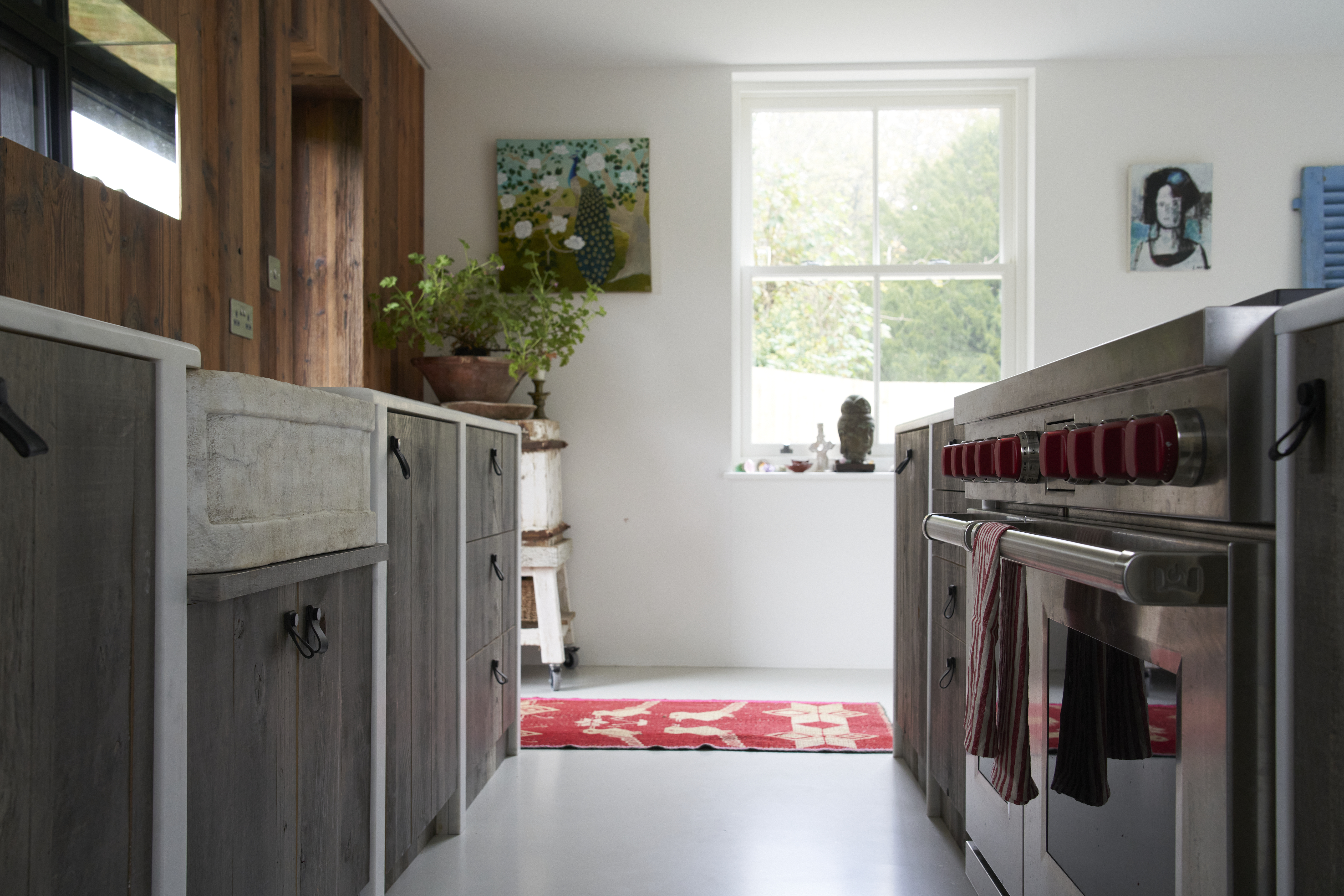 Beautiful, bohemian cottage kitchen in Tunbridge Wells. Doors, drawers and back wall clad in Admonter Reclaimed wood