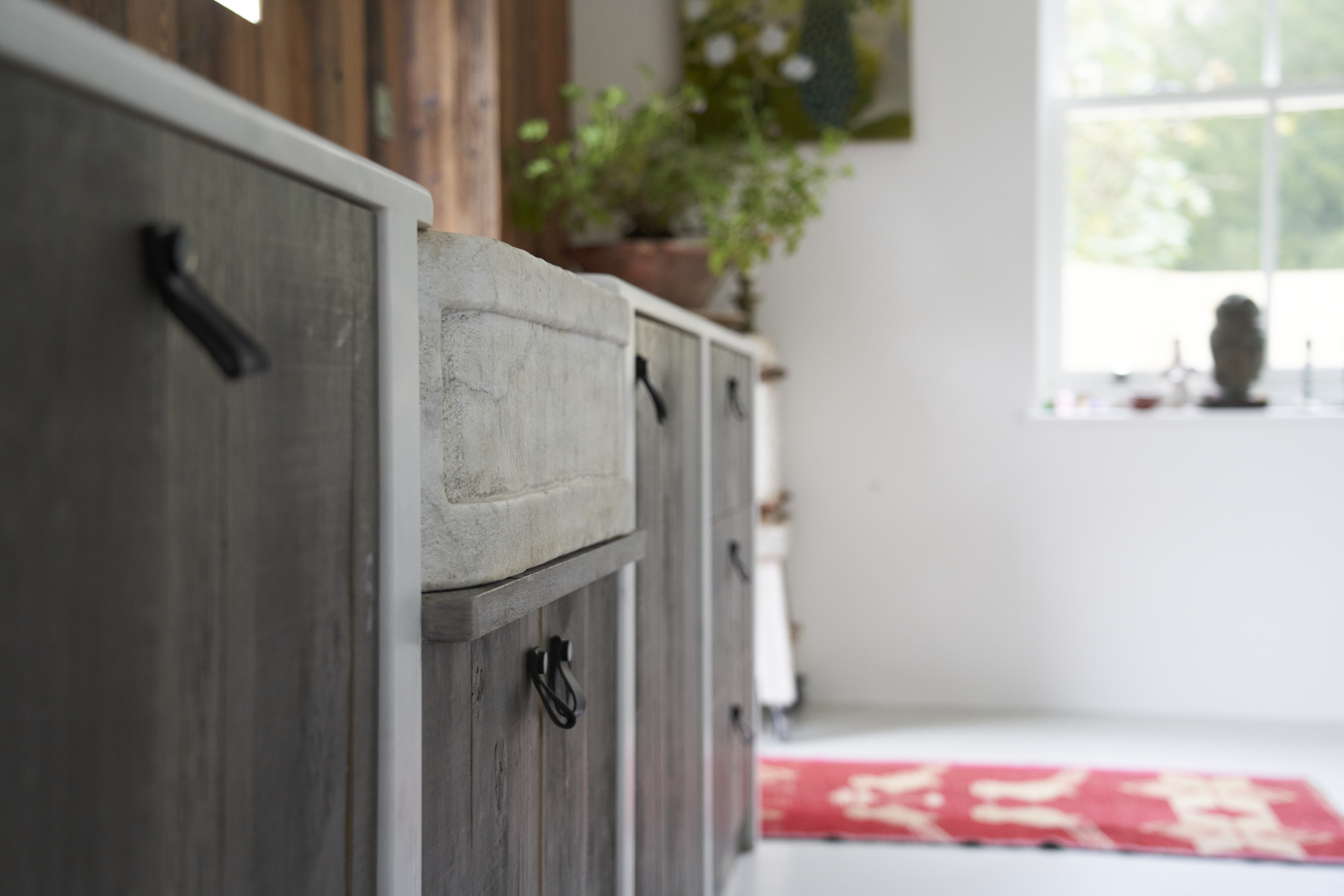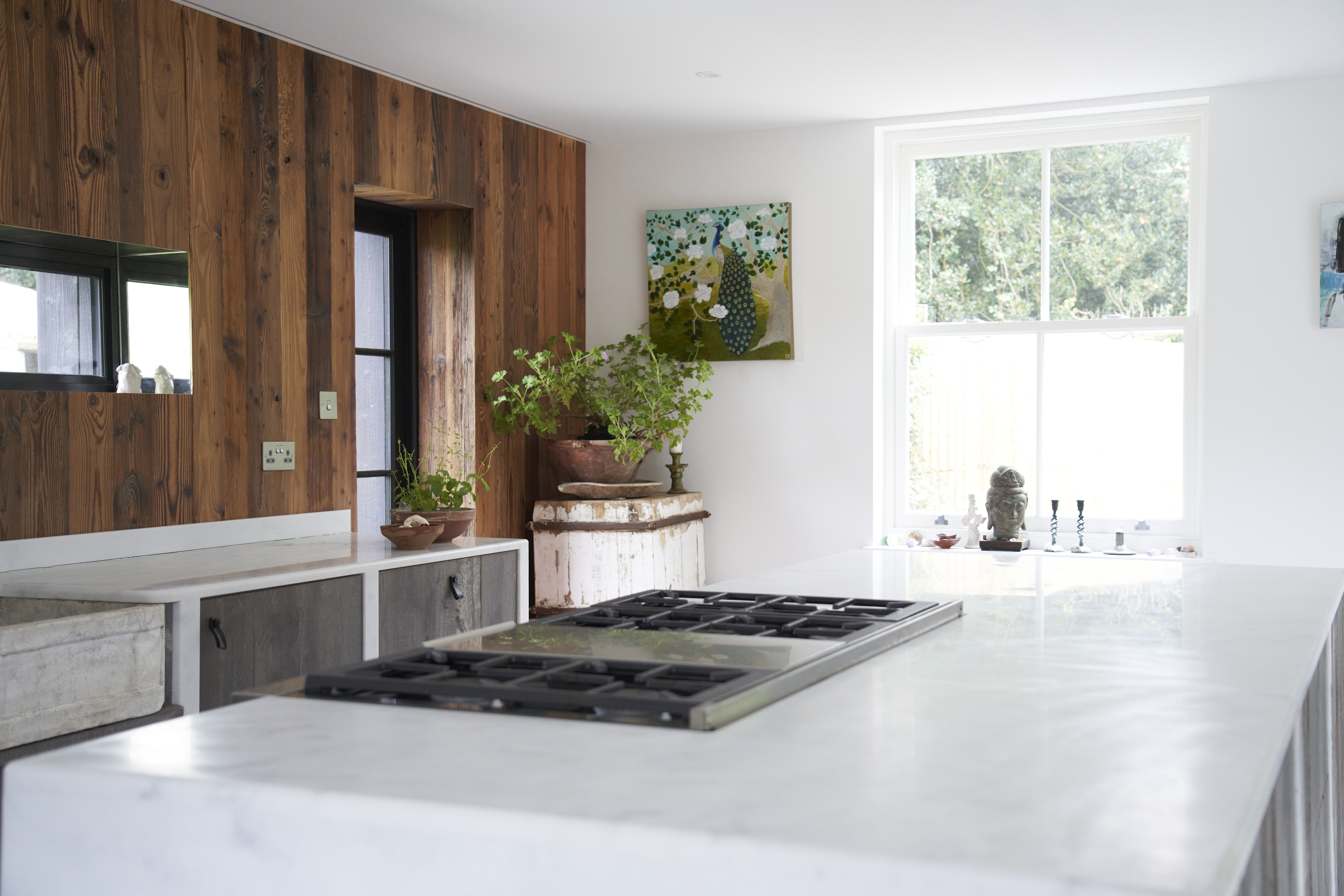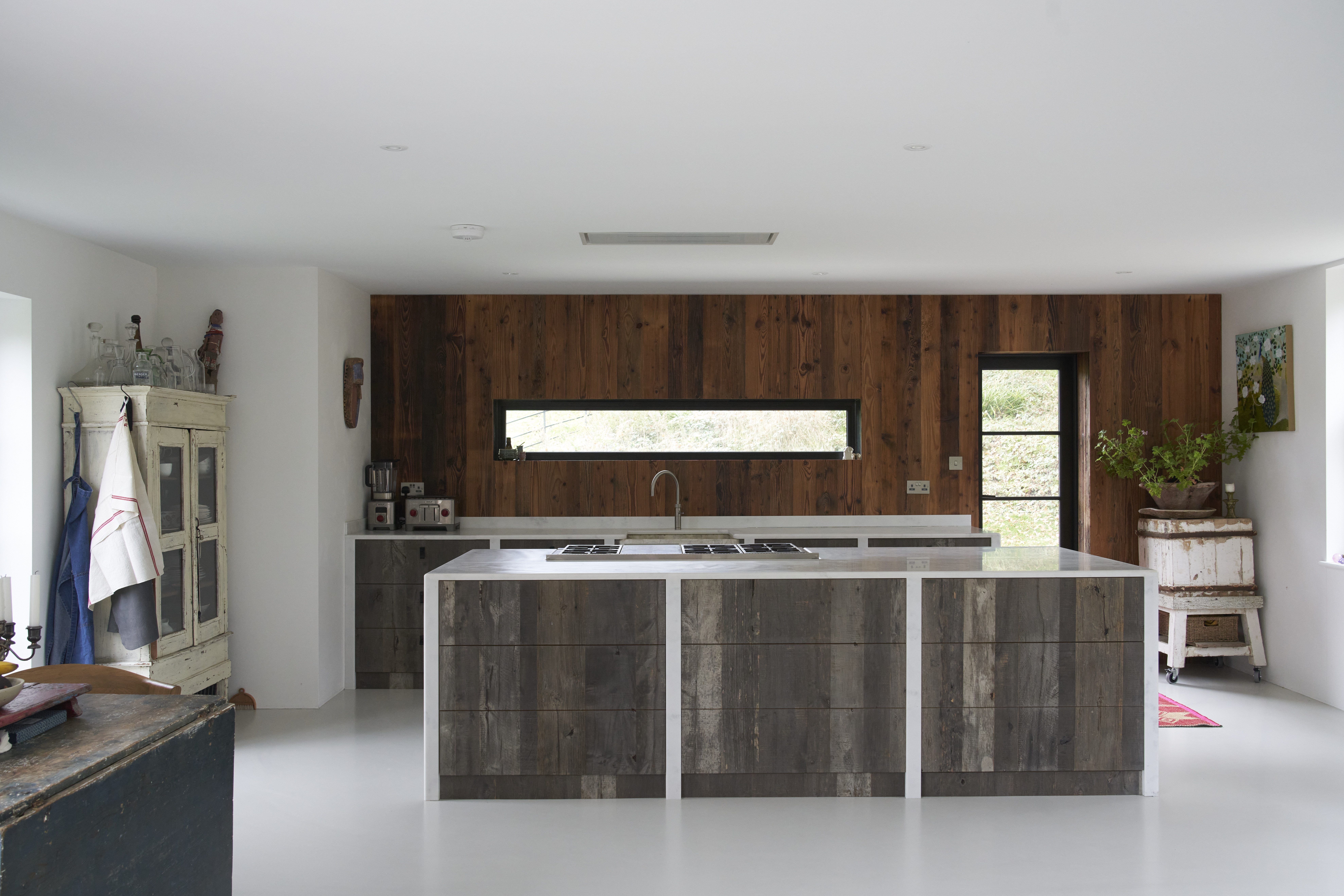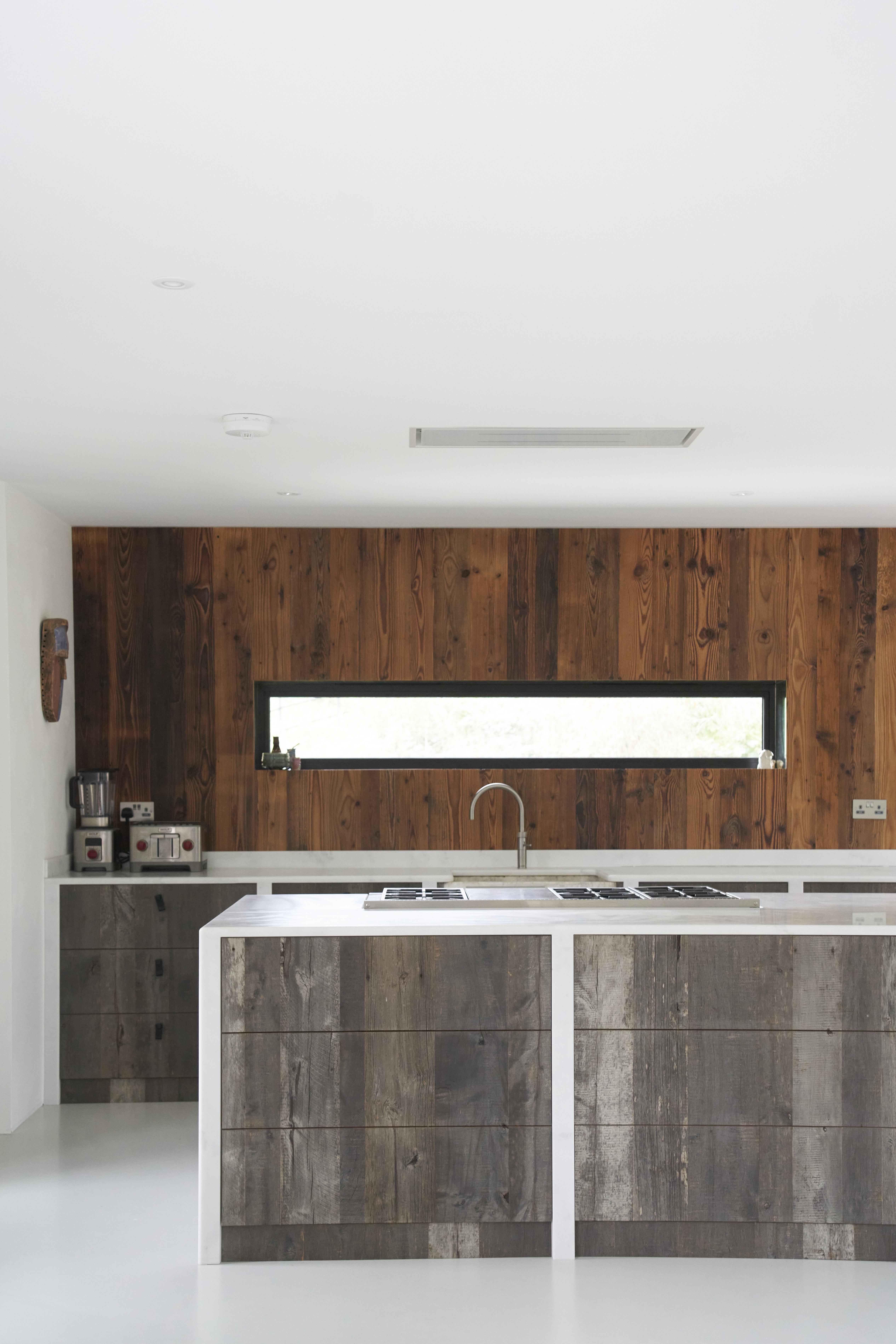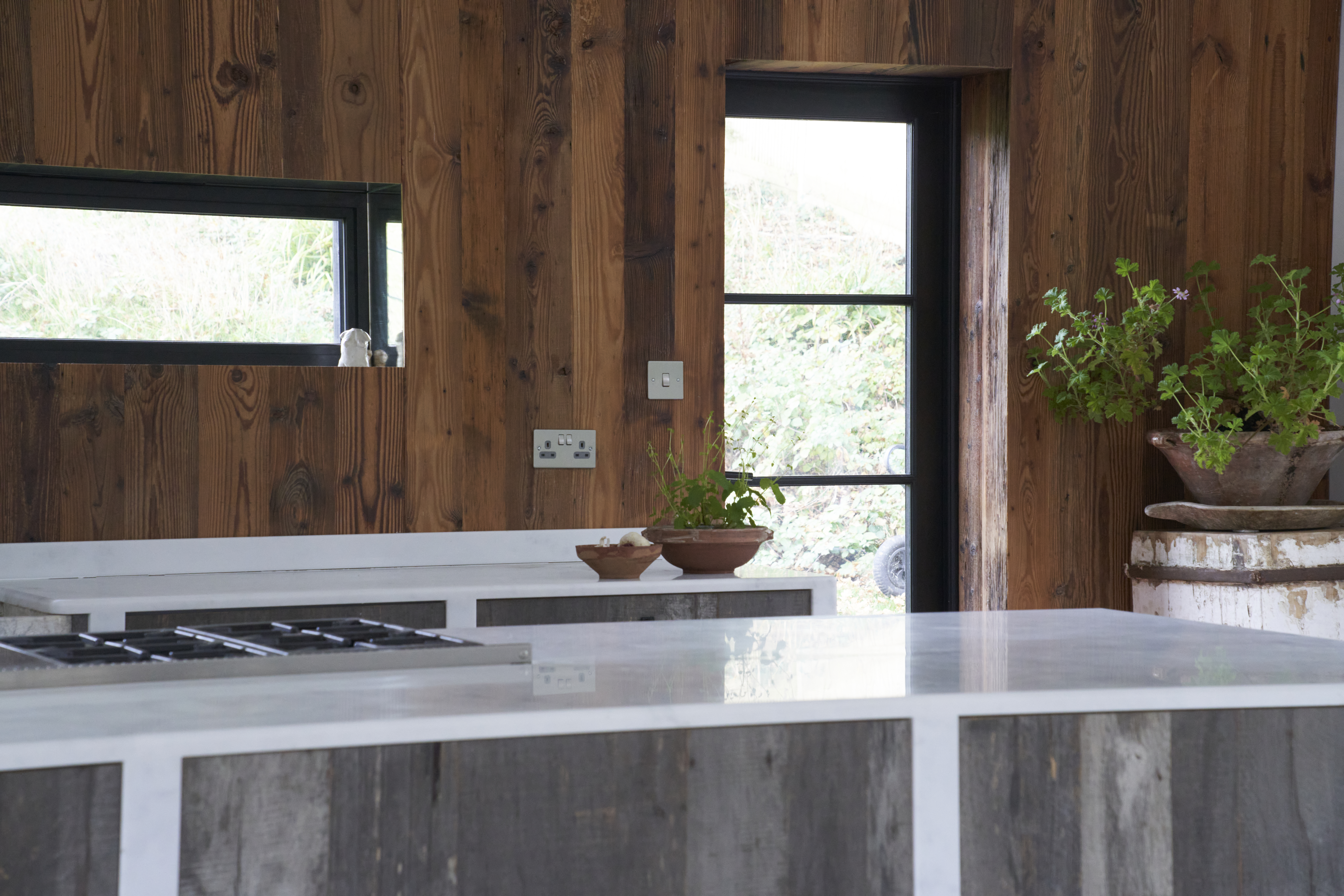 Beautiful, bohemian cottage kitchen in Tunbridge Wells. Doors, drawers and back wall clad in Admonter Reclaimed wood