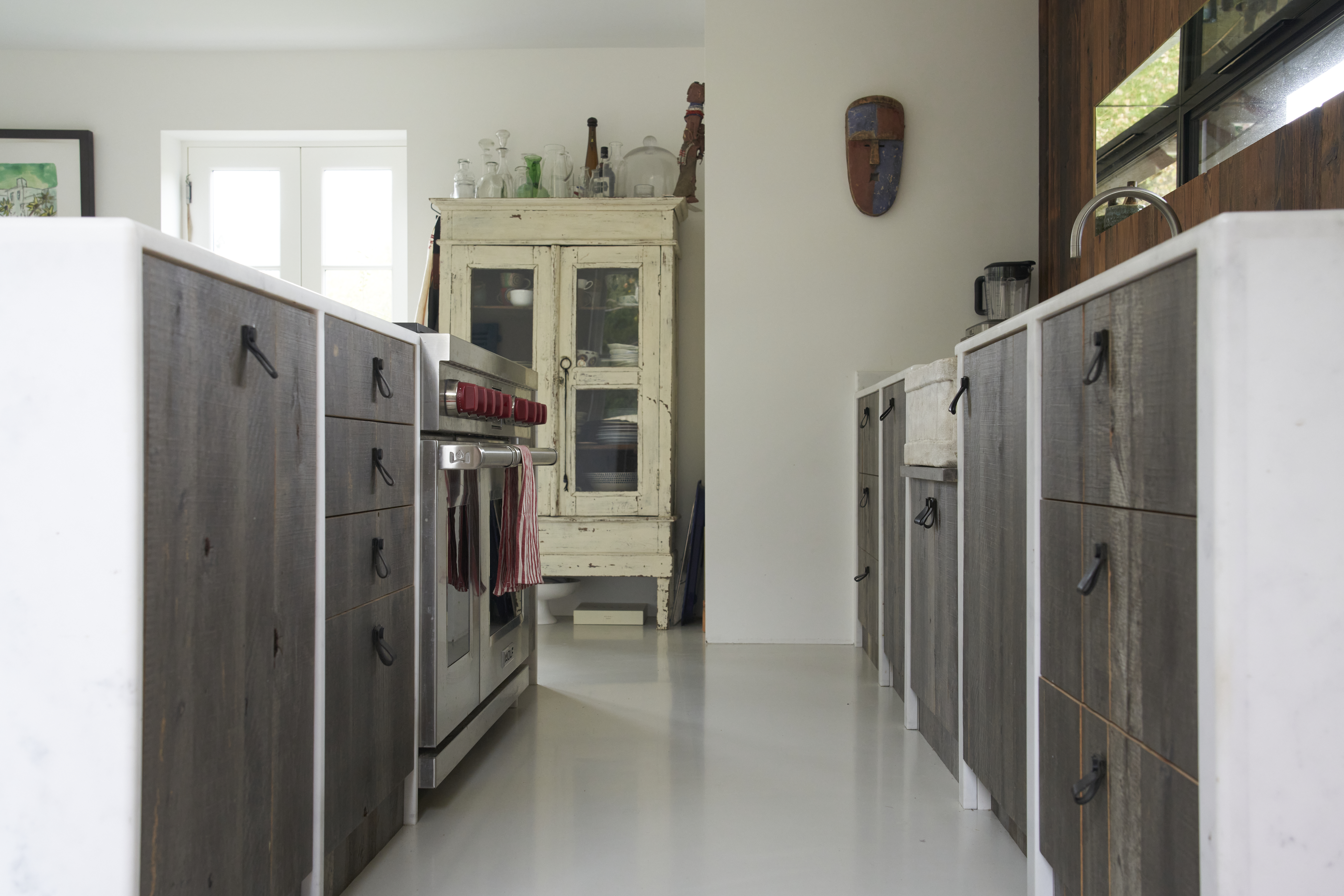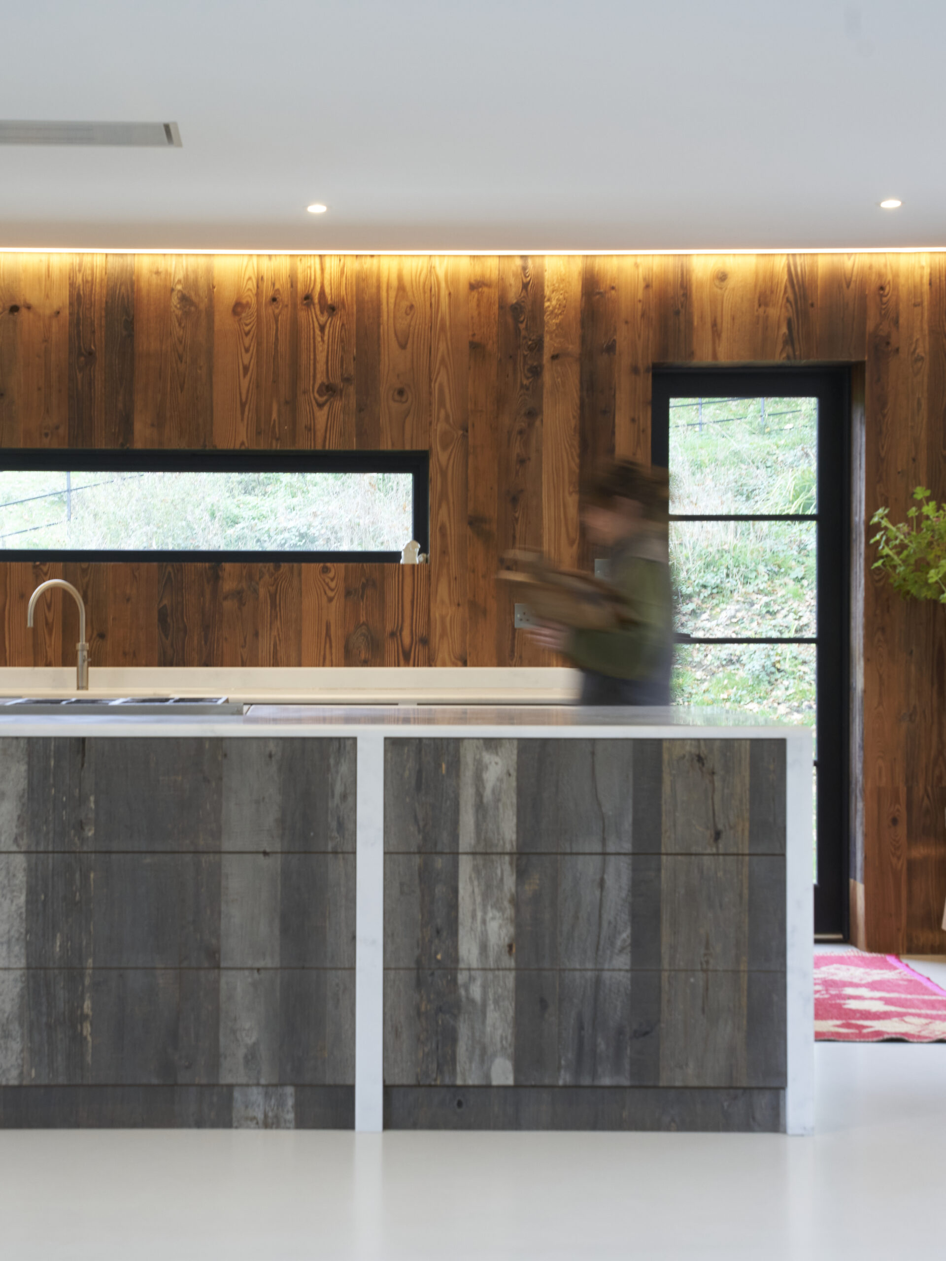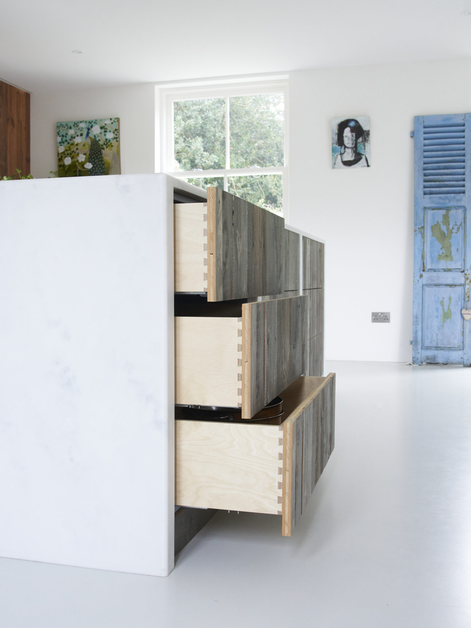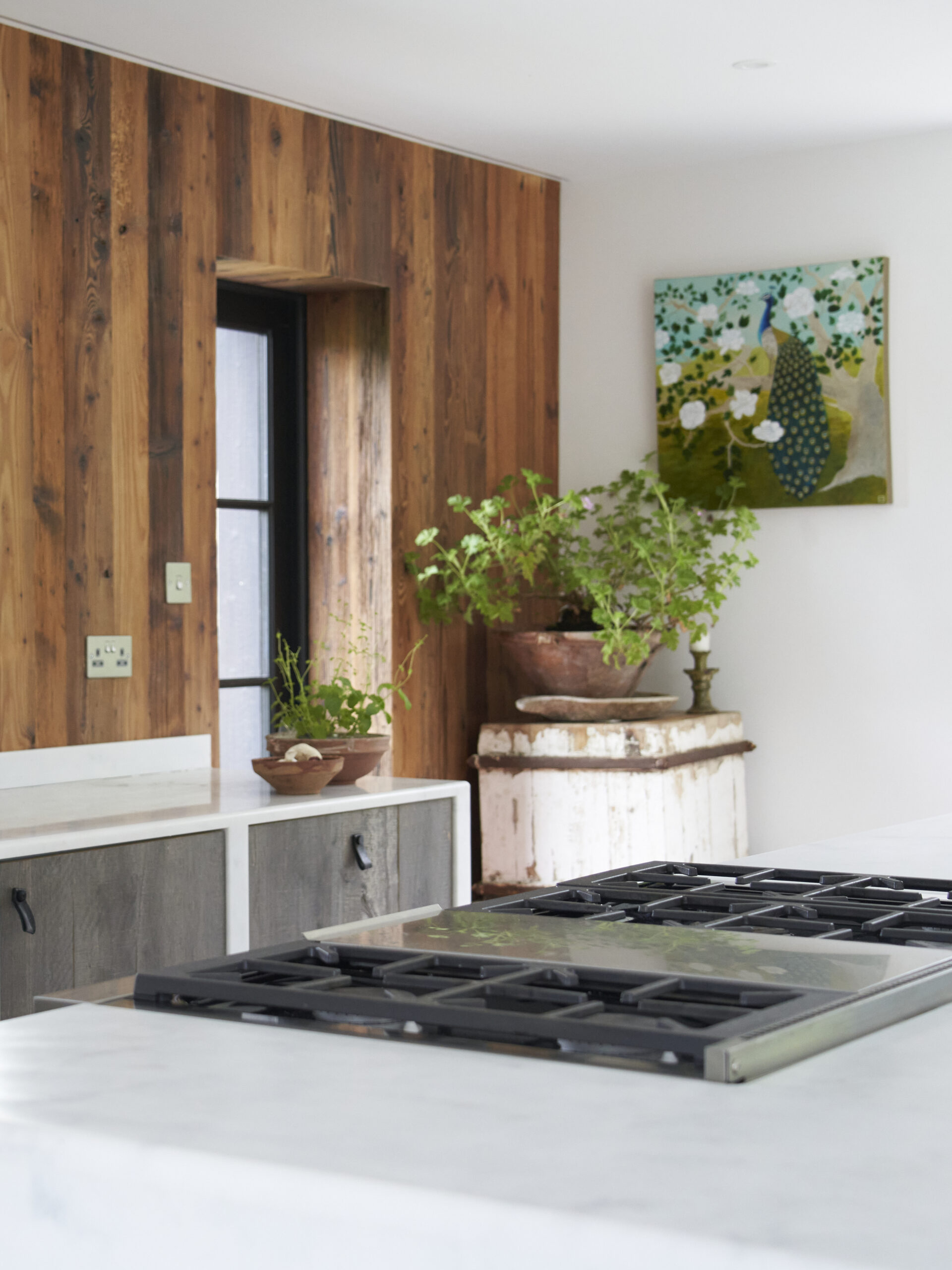 Beautiful, bohemian cottage kitchen in Tunbridge Wells. Doors, drawers and back wall clad in Admonter Reclaimed wood